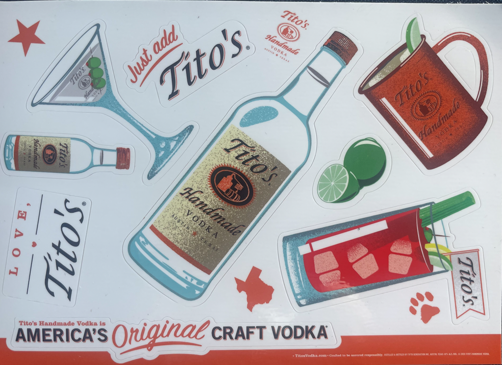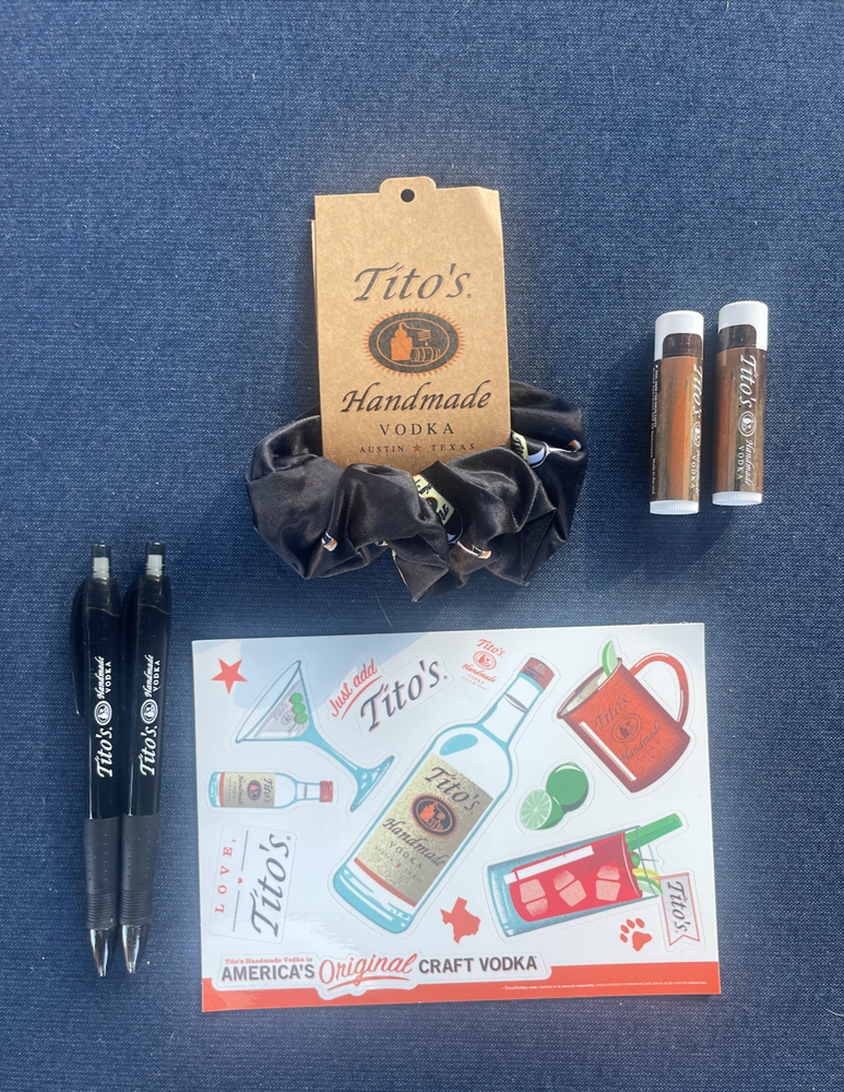 Tito's funpack includes: - 2 branded vanilla spf chapsticks, - 1 branded scrunchie - 2 Tito's pens - fun Tito's stickers. **Pick up during our scheduled days and time windows from any of these locations: DPS in Palo Alto, Sunnyvale, and Redwood City. The final day for pick-up is August 31st, 2023.**